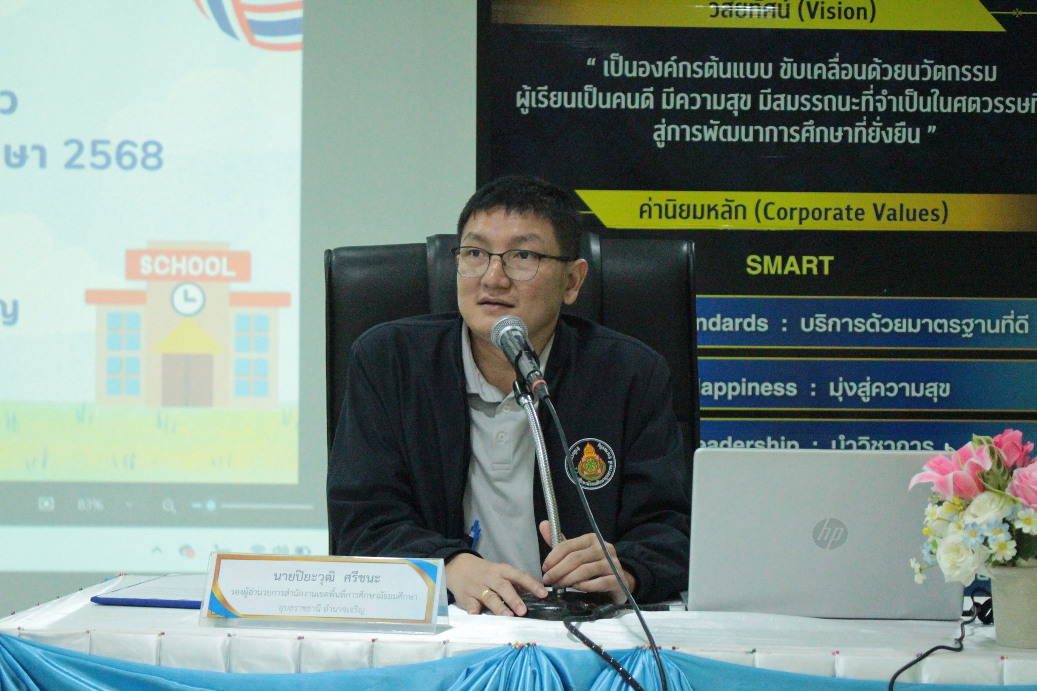 วันที่ 16 กรกฎาคม 2568 นางจารุวรรณ บุญโต ผู้อำนวยการสำนักงานเขตพื้นที่การศึกษามัธยมศึกษาอุบลราชธานี อำนาจเจริญ ได้มอบหมายให้ นายปิยะวุฒิ ศรีชนะ รองผู้อำนวยการฯ เป็นประธานในพิธีเปิด การประชุมเตรียมความพร้อมการประเมินโครงการสถานศึกษาสีขาว ปลอดยาเสพติดและอบายมุข ประจำปีการศึกษา 2568